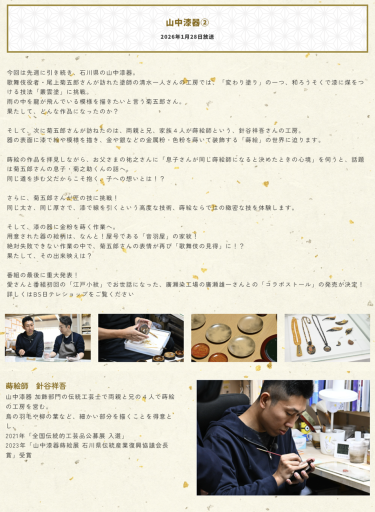 BS日テレ「 冨永愛の伝統to未来 」の山中漆器特集に当工房の針谷祥吾が取材されました!