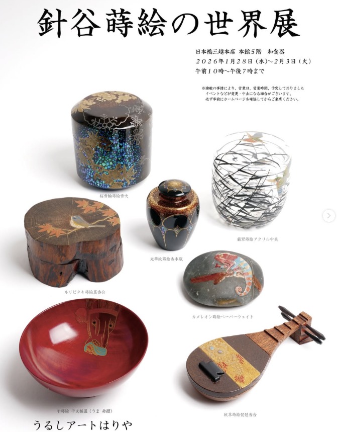 恒例となっております日本橋三越百貨店さんでのイベントのご案内をいたします。この機会でしか見られないものも沢山ございます。 皆様にお会いできるのを楽しみにしております。 短い期間ではございますが、万象お繰り合わせの上ご来場頂けますと幸いです。何卒よろしくお願いします。 「針谷蒔絵の世界展」 期間 : 2025年1月28日(水)~2月3日(火) 時間 : 10:00〜19:00 会場 : 日本橋三越本店 本館5階 和食器 担当: 針谷絹代・崇之 カテゴリー: 催事 タグ: kantoukinuyotakayuki 0件のコメント コメントを残す コメントをキャンセルメールアドレスが公開されることはありません。 * が付いている欄は必須項目です 名前 * メール * サイト ご意見、ご感想をお願いします。 次回のコメントで使用するためブラウザーに自分の名前、メールアドレス、サイトを保存する。